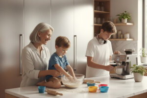 מבט כללי על סלון ישראלי שבו רואים דורות שונים – סבים יושבים עם הילדים והנכדים (1)