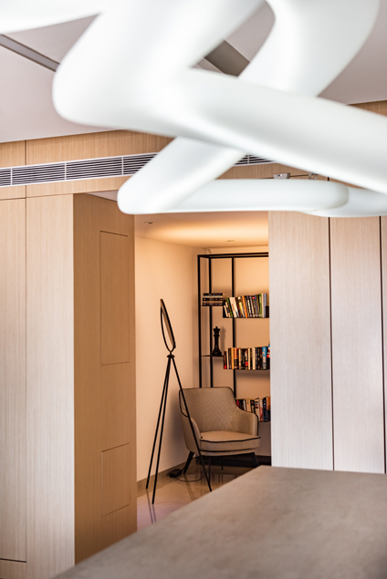 האלמנט המרכזי הוא אלמנט נגרות מרשים ונמתח מהכניסה לבית ועד המטבח, אלמנט זה חוצה את חלל הדירה לשני אזורים, ציבורי ופרטי, תוך כדי שהוא מכיל אחסון רב מאחסון לנעלים ומעילים בכניסה לדירה, מזווה ומקררים אינטגראלים במטבח ועד הצנעת התשתיות הטכניות ארון חשמל ותקשורת ואפילו המזגן. כל זה על מנת לתת מראה נקי ומנימלסטי שיהווה רקע והדגשה לגוף התאורה הפיסולי, המוסיף תחושת תלת-ממד למרחב ומכהן גם כיצירת אמנות ומקור אור,